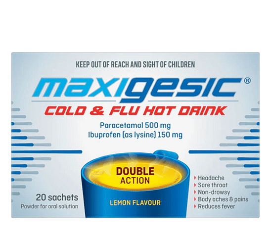 Developed in New Zealand, Maxigesic® Cold & Flu Hot Drink is a unique, patented combination of paracetamol 500mg and ibuprofen 150mg that provides fast, effective double action relief from winter ills and chills, a wide range of pain symptoms, and also helps reduce inflammation and fever.