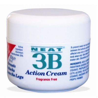 Neat 3B Action Cream incorporates an effective antiperspirant in an emollient, soothing cream base for application to areas where skin surfaces rub together and become inflamed.