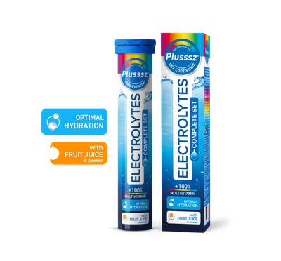 Plusssz Electrolytes + 100% Multivitamin contains 100% electro complex - a special set and concentration of all the most important electrolytes (sodium, potassium, magnesium, calcium and chlorine), glucose and a complex of the 10 most important vitamins in amounts providing 100% of the daily Reference Intake Values for adults. Recommended during hot weather, travel, sports activity, mental effort, physical work, after excessive alcohol consumption and fatigue. It quenches thirst and hydras the body. Take care of fluid replenishment!
