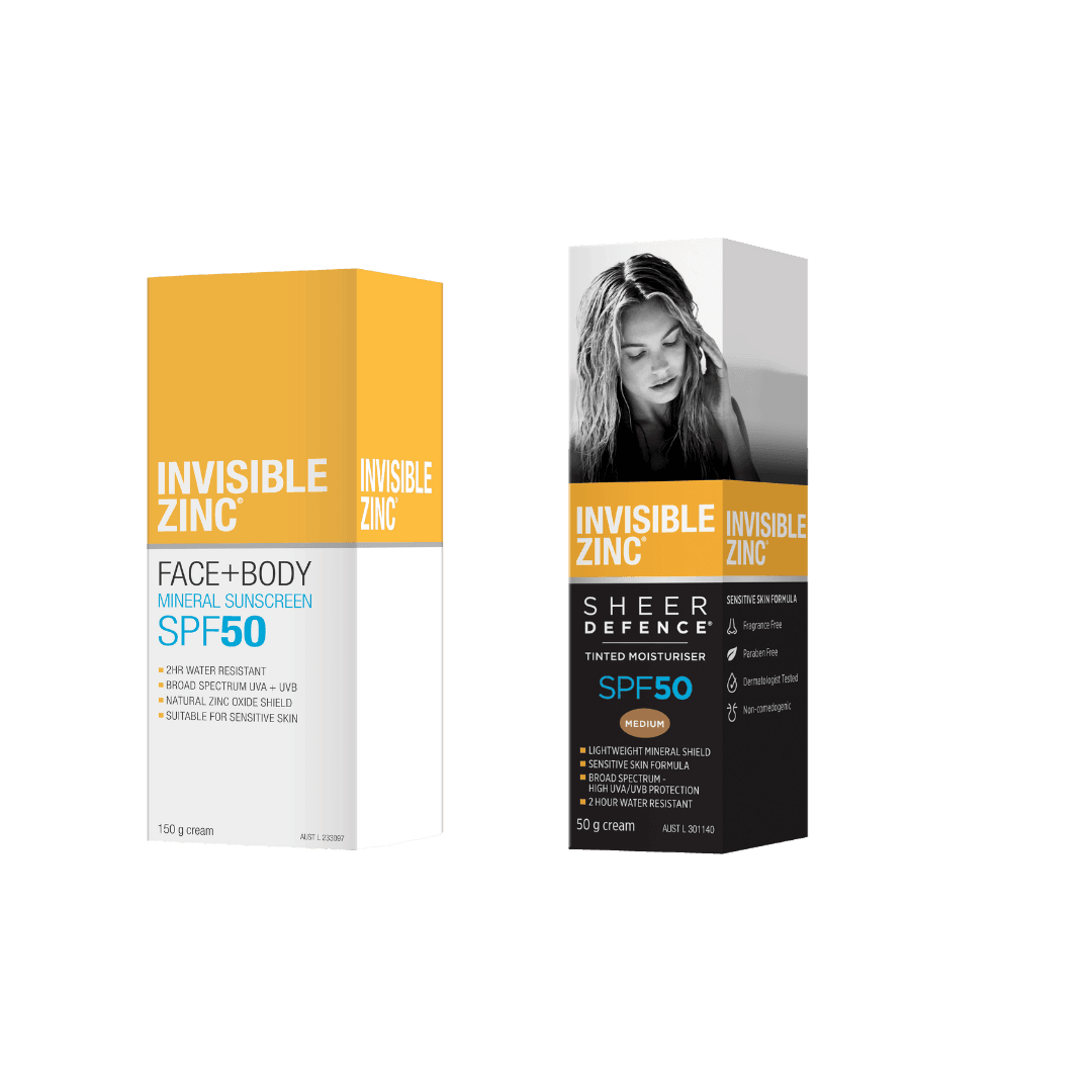 The Invisible Zinc Sheer Defence Tinted Moisturiser range is a lightweight formula that is non-comedogenic and is ideal to use every day on the face, with or without makeup. Available in Light or Medium tints or Untinted (rubs in clear). Its broad spectrum SPF50 formulation is 2 hours water resistant and is ideal for sensitive skin and all skin types. It is fragrance and paraben free.