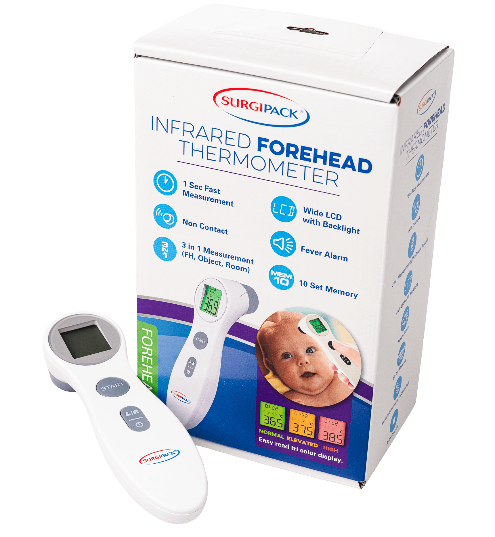 Surgipack Infrared Forehead Thermometer allows a 1 second, non-contact measurement of the body temperature via scanning of the forehead. This device has no age or gender limitations and provides the advantage of temperature measurement without disturbing the individual.