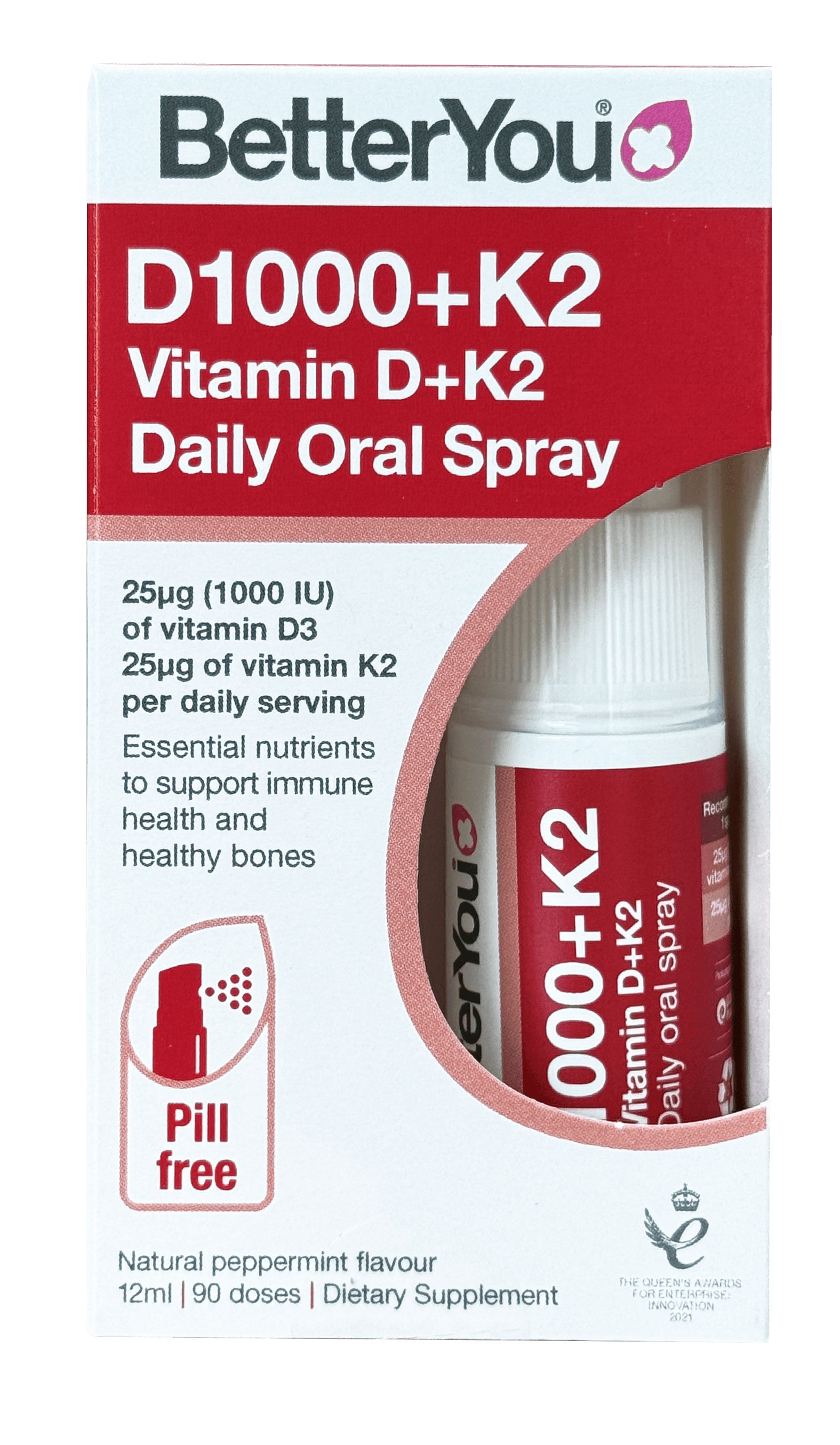Delivering a dosage of 1000IU vitamin D3 and 25μg (micrograms) of vitamin K2 per 1 spray, BetterYou D+K2 Vitamin Oral Spray is formulated to provide optimal nutritional delivery of these two vital vitamins.